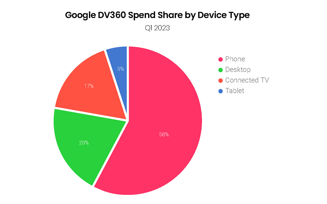 Connected TV accounted for 17% of spend for placements made through Google DV360 in Q1 2023. CTV share of DV360 spend is relatively strong primarily due to the impact of YouTube placements purchased through the platform. Phones still generated the lion’s share of DV360 spend in Q1, however, accounting for 58% of advertiser investment in the platform. Desktop contributed another 20% of DV360 spend in Q1, while tablets accounted for just 5%.