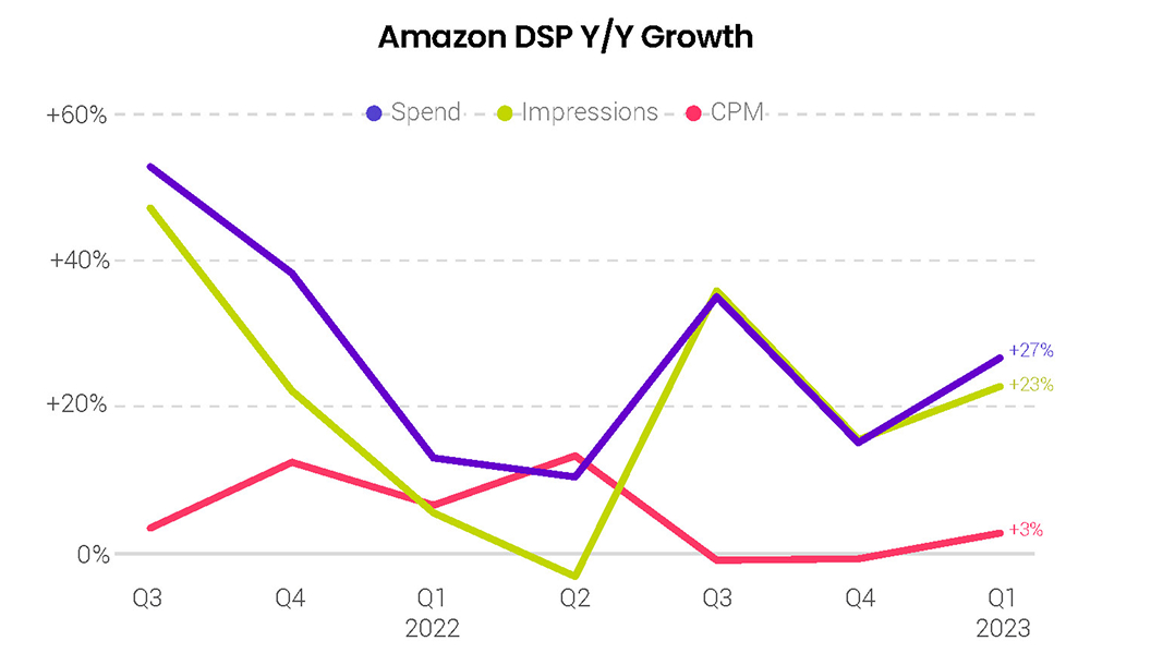 Spend growth for the Amazon demand-side platform (DSP) rebounded from 15% Y/Y in Q4 to 27% in Q1, as impression growth accelerated from 16% Y/Y to 23%. CPM growth has been modest over the last three quarters, rising 3% in Q1 after holding steady year over year in the f inal quarter of 2022. The share of DSP spend coming from Amazon owned-and-operated inventory, which carries a higher CPM than other inventory available through the DSP, rose slightly from Q4 to Q1.