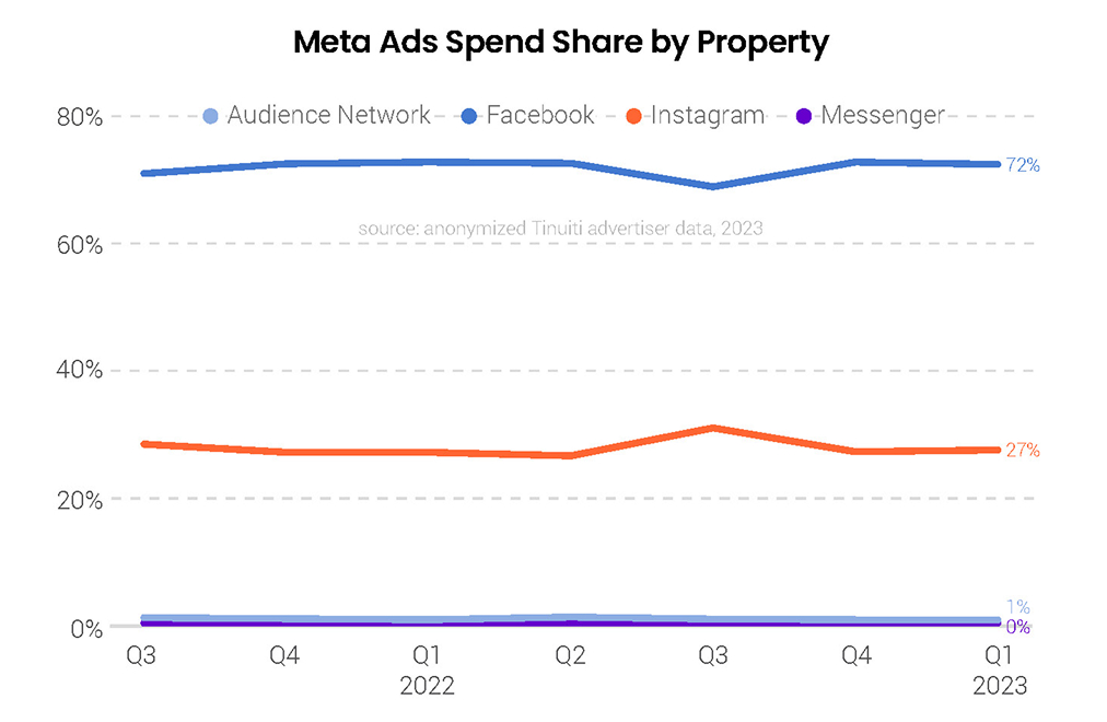 Facebook accounted for 72% of total Meta ad investment in Q1 2023, nearly identical to the share it accounted for in Q4 2022. Instagram spend share was also roughly the same in Q1 2023 as last Q4, and the Audience Network, which was most impacted by Apple’s App Tracking Transparency (ATT) update, continues to account for just 1% of total Meta investment. Messenger has yet to break past a small fraction of a percentage of spend attributed to Meta ad properties.