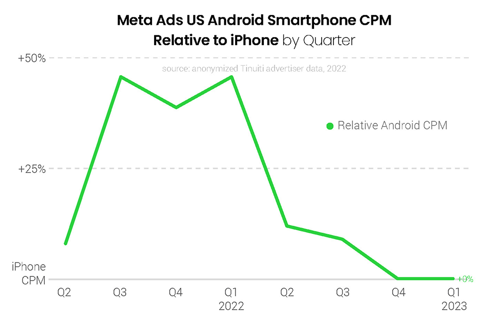 For the second straight quarter, Android smartphone and iPhone CPMs were identical across Meta ads in Q1 2023. Android smartphone CPM soared relative to iPhone CPM in the quarter immediately following the release of the Apple App Tracking Transparency (ATT) prompt, as there appeared to be relatively more demand for those users who could still be targeted and tracked using mobile IDs. Android CPM was still 46% higher in Q1 2022, but the difference steadily evaporated from there.