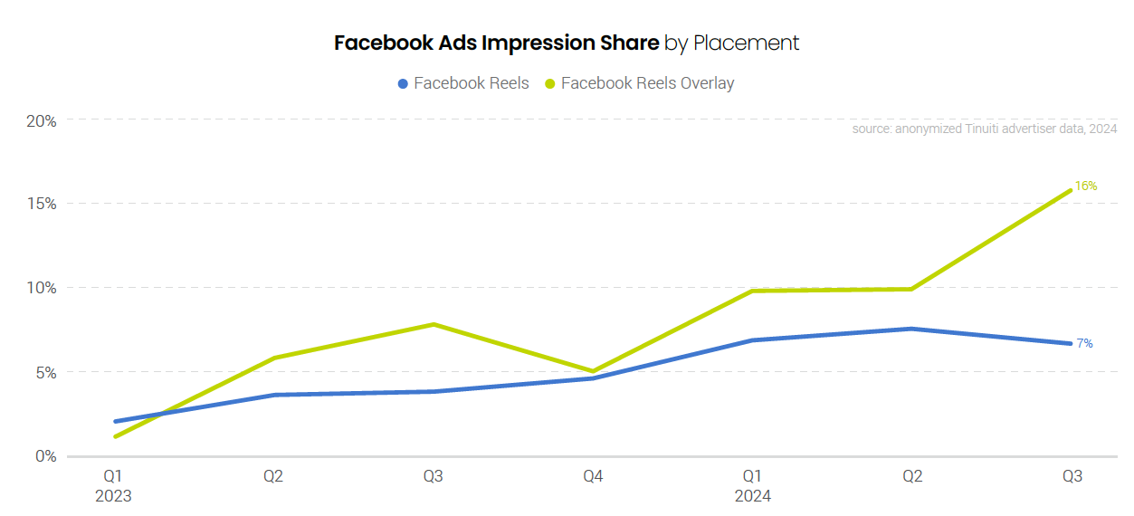 Between Reels video ads and Reels overlay ads, nearly a quarter of all Facebook ad impressions were attributed to Reels placements in Q3 2024, a significant rise from the 12% of Facebook ad impressions these units accounted for last Q3. Reels overlay ads, which are banners/stickers featured on top of Reels videos, accounted for 16% of all ad impressions on Facebook but are not a meaningful part of Instagram inventory at this point.