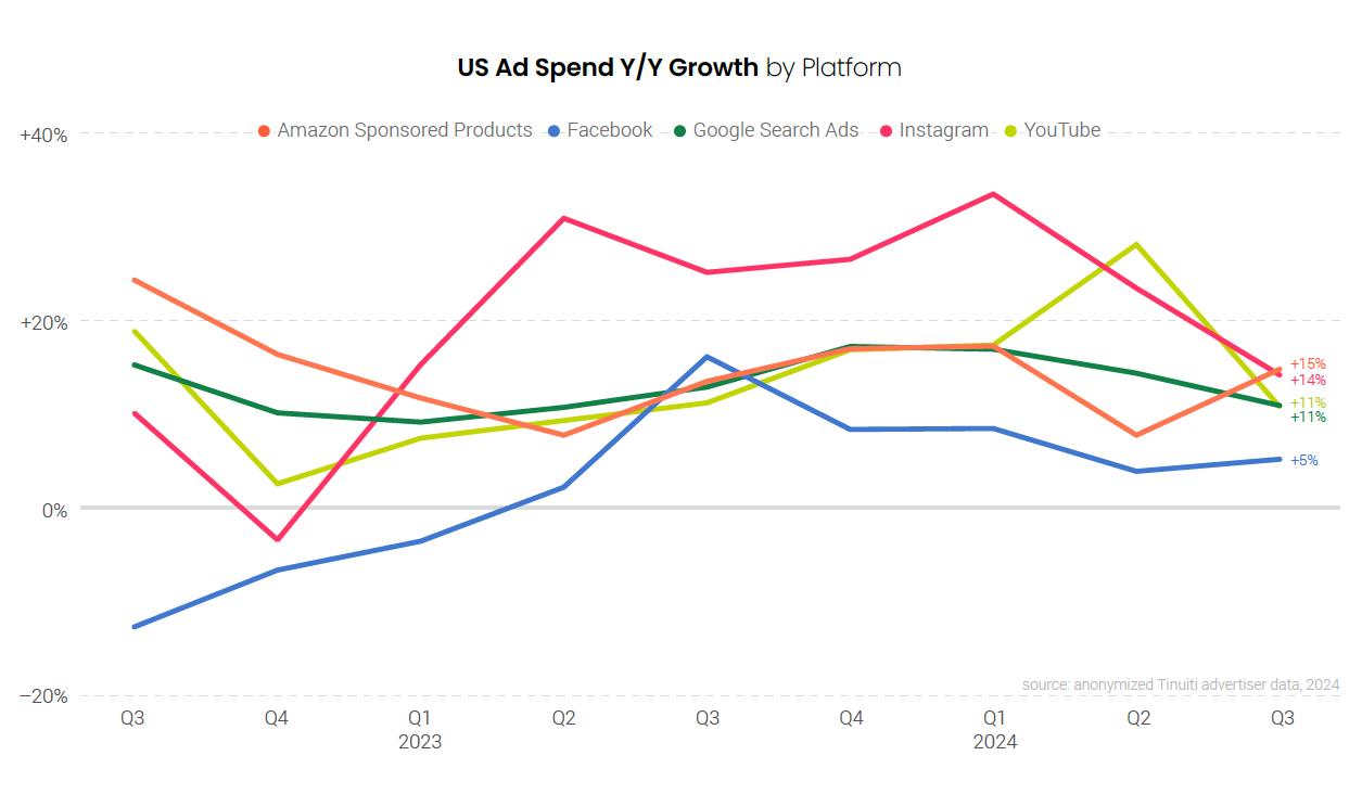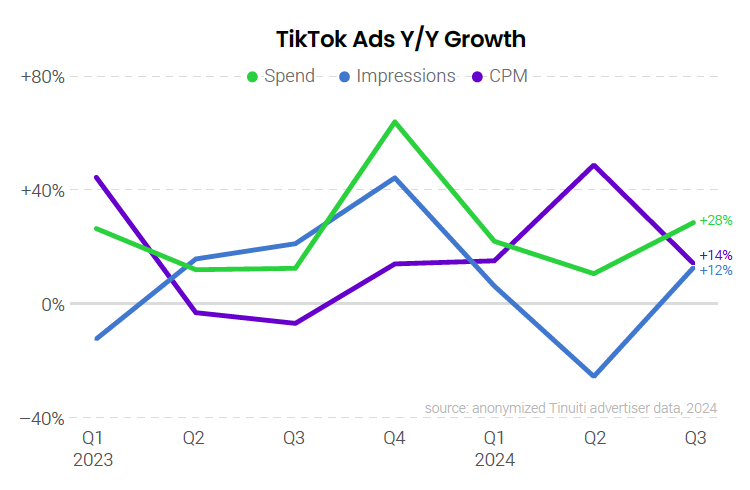 The median Tinuiti advertiser active on TikTok since at least Q3 2023 increased spend 28% year over year in the third quarter, the strongest growth observed since last Q4 when budgets rose 64% to reach TikTok users during the busy holiday shopping season. While TikTok’s future in the US remains unclear, advertisers are not yet reallocating TikTok ad dollars as they wait to see whether the platform is eventually sold or goes dark in the US.