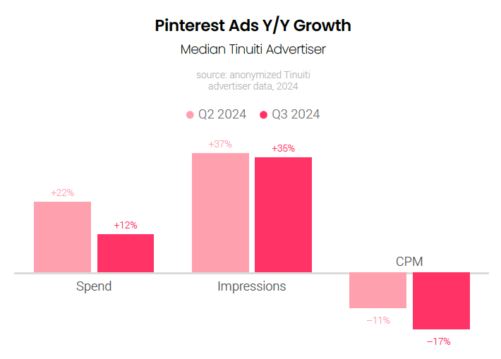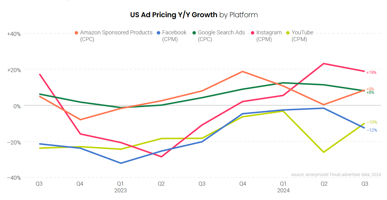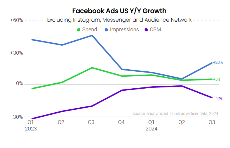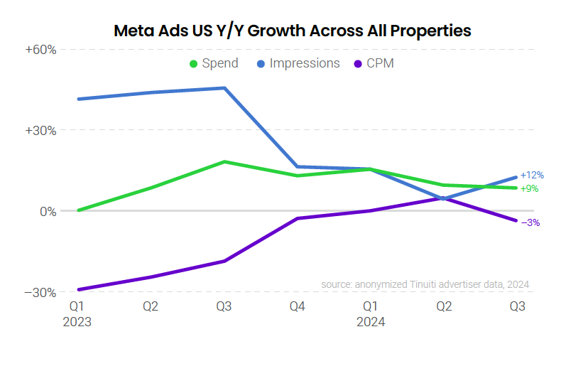 Tinuiti advertisers invested 9% more in Meta properties, including Facebook and Instagram, in Q3 2024 than in Q3 2023, a slight deceleration from the 10% growth observed in Q2. CPM dipped 3% year over year, compared to a 5% increase in Q2, but with CPM declines slowing from Q2 to Q3 in 2023, two-year CPM growth was nearly identical in the second and third quarters of 2024. Impressions rose 12% in Q3, accelerating from 4% growth in Q2.