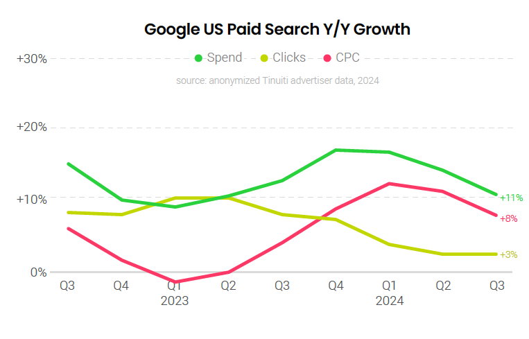 Spending on Google paid search ads rose 11% Y/Y in Q3 2024, down from 14% growth a quarter earlier. While click growth was steady at a little under 3% Y/Y, growth in average CPC slowed from 12% Y/Y in Q2 to 8% Y/Y in Q3. Search ad CPC growth had bottomed out at a 1% Y/Y decline in early 2023 as concerns about the economic outlook depressed ad pricing. CPC growth rose over the following year as those concerns faded, and advertisers are now facing strong year-ago pricing comps.