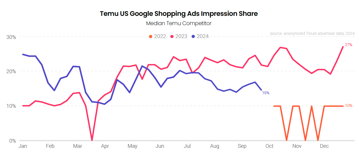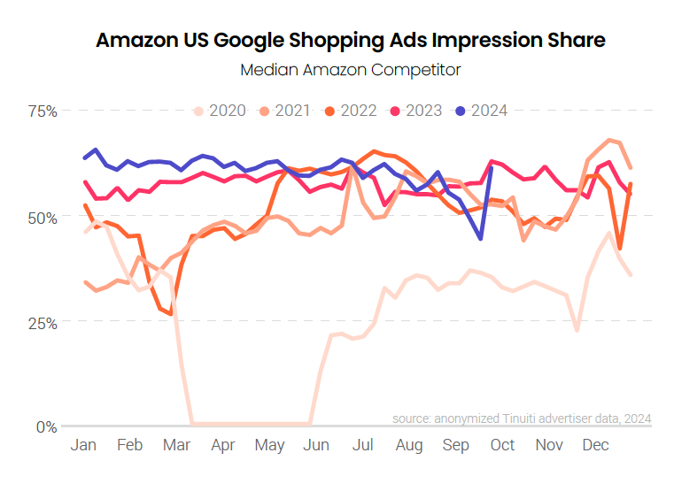 Weak growth for traditional Google text ad clicks has come at a time when one of the largest competitors for Google impressions, Amazon, has actually dialed back its presence in Google text ad auctions. Until the very last week of Q3, Amazon’s text ad impression share against the typical retailer was down compared to 2023 for 29 straight weeks. This decline does not appear to be related to the large investment Temu has made in digital ads as Temu’s presence in Google text auctions has been minimal.