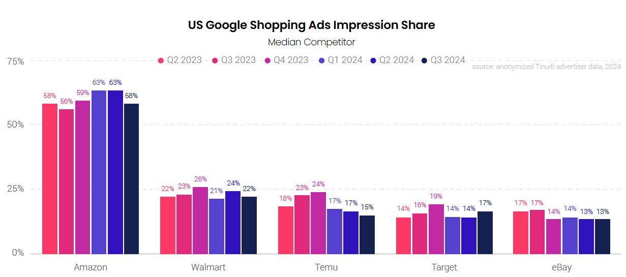 While Amazon leads other major retailers in Google shopping impression share by a healthy margin, the results are closer when considering the share of all retailers that see one of these retail giants as a competitor for shopping impressions. In Q3 2024, 89% of retailers saw Amazon listed by Google as a top competitor for shopping impressions. That rate was 81% for eBay, 79% for both Temu and Walmart, and 59% for Target. These results are indicative of the breadth of product categories each of these retailers is advertising and Temu briefly matched Amazon in this respect in Q4 2023.
