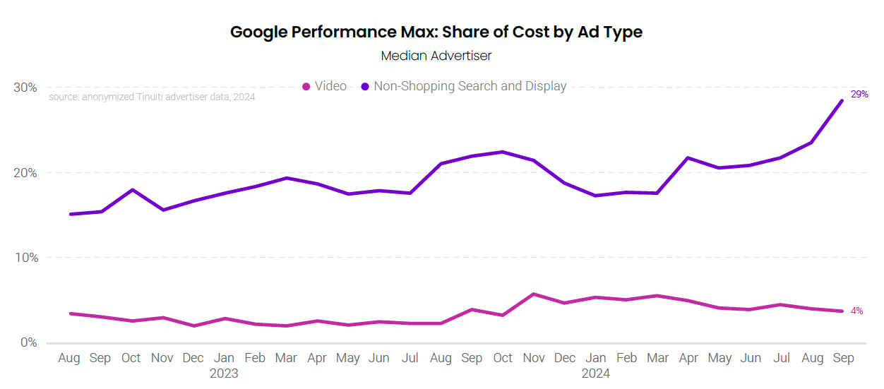 While shopping listings drive the bulk of PMax spending, advertisers have seen an uptick in costs associated with other types of inventory, particularly over the back half of Q3 2024. Non-shopping search and display ads accounted for 29% of PMax spending for retail advertisers in September 2024, up from 21% in June 2024. PMax spend share for video inventory has been steadier, averaging between 4-5% over the course of 2024.