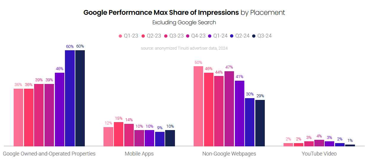 Outside of Google search, Google’s other owned-and-operated properties have driven a majority of PMax impressions for the last two quarters. The share of PMax impressions driven by mobile apps has been fairly steady at around 10% for the past year, but brands have seen a sharp drop in PMax impressions driven by non-Google webpages. In July, Google began providing advertisers with a breakout of YouTube videos in its Placements report, but YouTube accounted for just 1% of PMax placement impressions in Q3 for the average retailer.