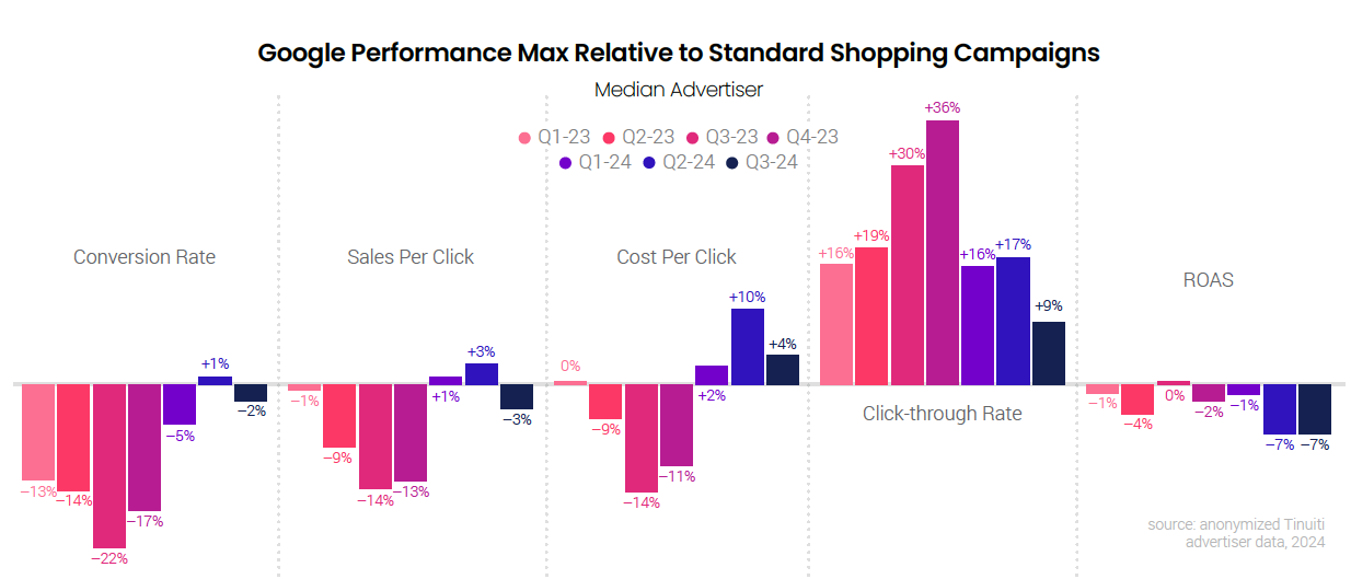 Along with the uptick in PMax cost share of non-shopping inventory, brands saw a drop in conversion performance for PMax campaigns relative to standard Shopping campaigns (SSCs), albeit a fairly small one. PMax conversion rates were 2% lower than that for SSCs in Q3 2024, down from a 1% advantage a quarter earlier. Similarly, PMax sales per click fell from a 3% advantage over SSCs in Q2, to a 3% deficit in Q3. With PMax CPCs also coming down relative to SSCs in Q3, advertisers were able to maintain the relative ROAS they generated in Q2.