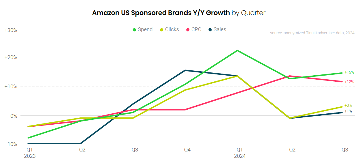 Amazon Sponsored Brands spend, including Sponsored Brands video investment, rose 15% year over year in the third quarter, the same growth rate as Sponsored Products campaigns. Clicks climbed 3% compared to a year prior and CPC increased 12%, marking the second straight quarter of double-digit CPC increases. The cost of clicks rose even more during the July Prime Day event when pricing jumped 15% compared to Prime Day 2023.