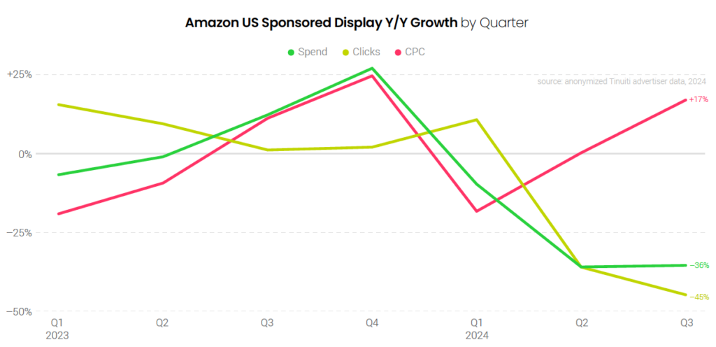 Advertisers pulled back on Sponsored Display campaigns in the third quarter with spend down 36%, the same decline observed in Q2. While Sponsored Display spend is waning, advertisers continue to significantly ramp up investment in the Amazon demand-side platform (DSP) which saw spend rise 26% year over year in Q3. As such, display advertising is still hugely important for Amazon advertisers.