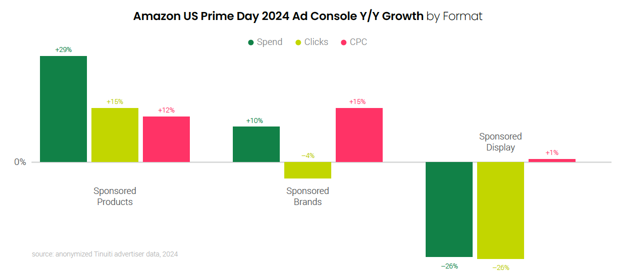 Amazon advertisers ramped up Prime Day investment in Sponsored Products by 29% year over year, marking the second straight year of Amazon’s premiere sales event that the format grew at a faster pace than the other two Ad Console campaign types, Sponsored Brands and Sponsored Display. Prime Day CPC for Sponsored Products and Sponsored Brands rose 12% and 15% Y/Y, respectively, as advertisers competed for high intent shoppers.