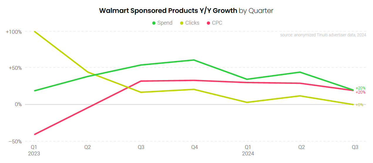 For the sixth straight quarter Walmart search advertisers increased spend on Sponsored Products by at least 20%, with clicks flat year over year in Q3 and CPC rising 20%. The 20% increase in CPC is the slowest growth observed since Q2 2023, as pricing grew by at least 30% in each of the last four quarters as brands lapped a year in which CPC was depressed thanks to Walmart’s change from a first-price auction to a second-price auction.