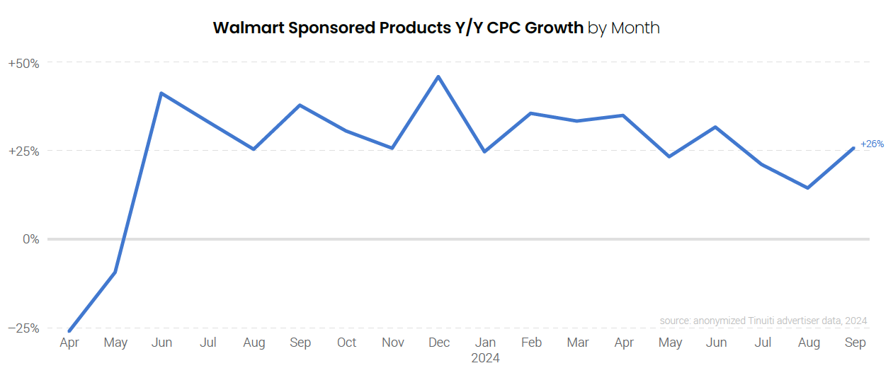 CPC growth for Walmart Sponsored Products ads slowed to just 14% in August 2024, the slowest rate of growth since May 2023, but ramped back up 26% in the final month of the quarter. While year-over-year CPC growth from Q2 2022 through Q2 2024 was primarily a result of the aftermath of Walmart’s change to a second-price auction model, changes in pricing are now more indicative of shifts in the value of ad clicks, as the sales per click of Walmart Sponsored Products rose 22% in the third quarter compared to a 20% increase in CPC.