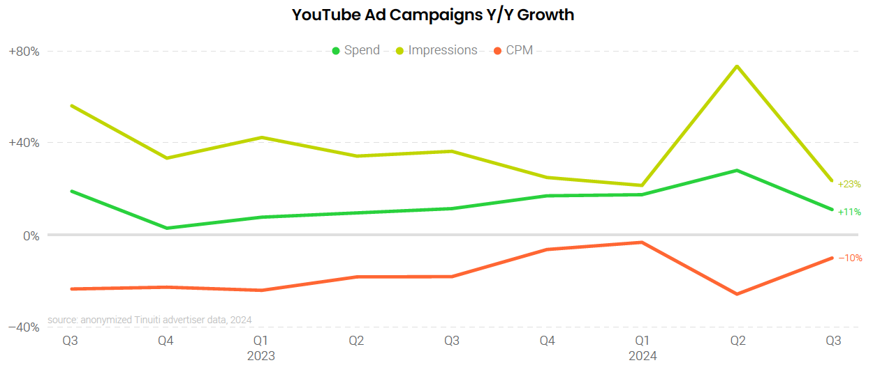 Spending on YouTube ads grew 11% in Q3 2024, down from 28% growth a quarter earlier. In Q2, Tinuiti advertisers saw a spike in impression volume that drove up spending while depressing average CPM. The deceleration in spending growth in Q3 is more in line with official YouTube revenue metrics and more reflective of strengthening year-ago spending growth comparisons.