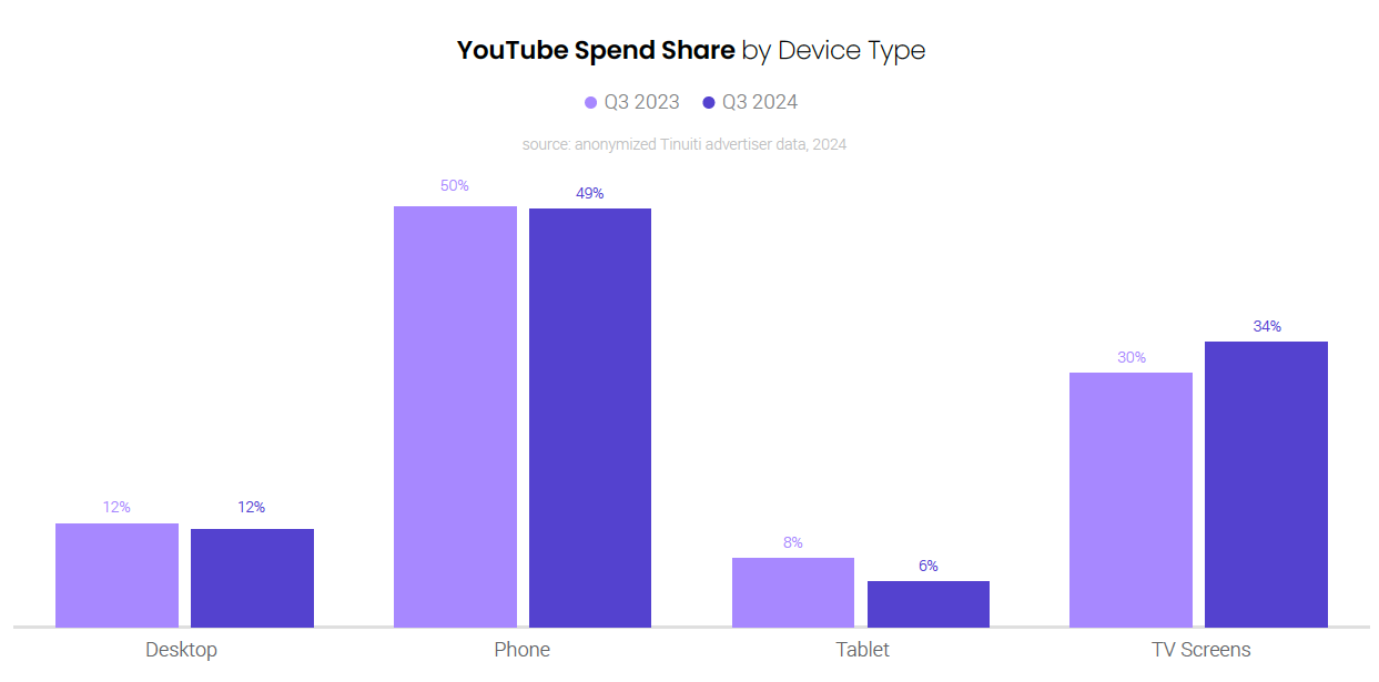 TV screens accounted for 34% of YouTube spending in Q3 2024, up from 30% a year earlier. Spending on YouTube ads on TVs was up 24% Y/Y, more than double the rate of growth of other devices. YouTube ad spending on phones was up 10% Y/Y in Q3, but phone share of spend slipped from 50% in Q3 2023 to 49% in Q3 2024. Tablets saw the greatest decline in spend share from year to year with tablets accounting for 8% of spend in Q3 2023 and 6% in Q3 2024.