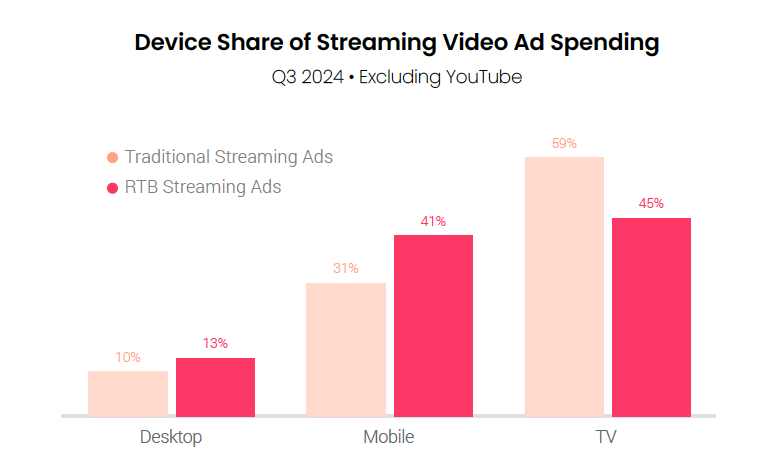 TV screens generated 59% of traditional streaming ad spending in Q3 2024 compared to 45% of spending on streaming inventory purchased through real-time bidding. Mobile devices, including both phones and tablets, accounted for 31% of traditional streaming ad spending, but 41% of RTB spending in the quarter. Desktop accounted for 10% and 13% of spending on traditional and RTB ads, respectively.