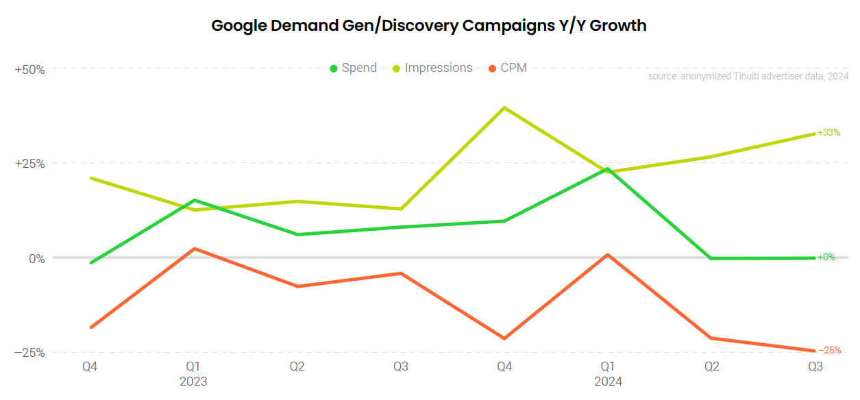 Although Google Demand Gen campaigns saw strong adoption trends in Q3, advertisers that have remained consistently active in this space saw no spending growth for the second straight quarter. While Demand Gen campaigns have seen strong impression growth year over year, those gains have been offset by large decreases in average CPM.