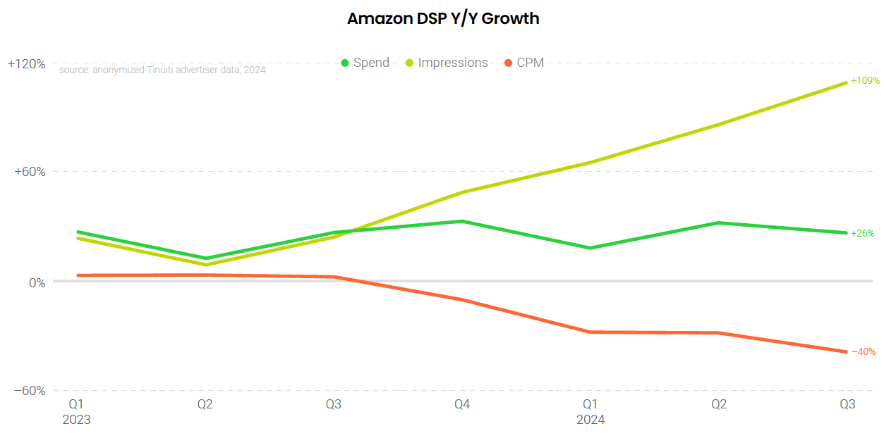 Advertisers increased investment in the Amazon demand-side platform (DSP) by 26% year over year in the third quarter, slower than the 32% observed in Q2 but still faster than any of the three campaign types available through the Amazon Ad Console: Sponsored Products, Sponsored Brands, and Sponsored Display. Amazon DSP impressions more than doubled year over year, while CPM fell for the fourth straight quarter and declined 40% compared to last Q3.