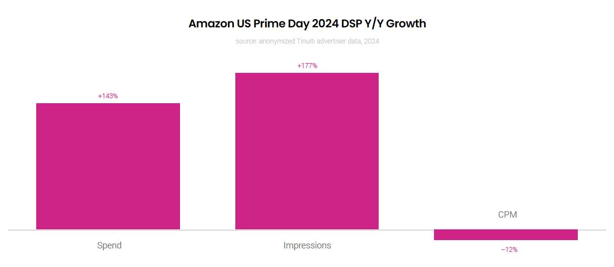 During Amazon Prime Day 2024, held on July 16 and 17, advertisers ramped up spend on the DSP by 143% compared to Prime Day 2023, held on July 11 and 12. Not only did brands spend big during Prime Day, but advertisers also ramped up spend in the days leading up to the two-day event to warm up shoppers, and kept spend elevated post-Prime Day to stay in front of customers who may have viewed products during the event.