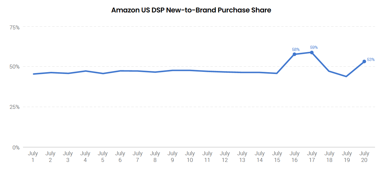 The share of purchases attributed to Amazon DSP advertising which were identified as coming from new-to-brand customers, defined as those shoppers who have not purchased from a brand in the past year, jumped from an average of 47% in the first two weeks of July to 59% during Prime Day. Big sales events like Prime Day typically produce elevated shares of new-to-brand customers which is part of the reason brands increase investment during these times.