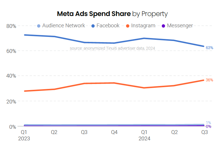 Meta advertisers spent 36% of all ad spend on Instagram, compared to 63% on Facebook. Instagram share rose from 34% last Q3, as spend growth on the platform continues to outpace that of Meta’s largest platform, Facebook. Just 1% of Meta spend was attributed to the Audience Network in Q3 2024, while Messenger continues to account for only a small fraction of a percentage point of Meta spend.