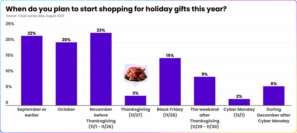 This is driving an expanded shopping season, with a whopping 65% of holiday shoppers expecting to start buying gifts before Thanksgiving this year. This early start is coupled with an overall intent to increase spending, primarily through digital channels.